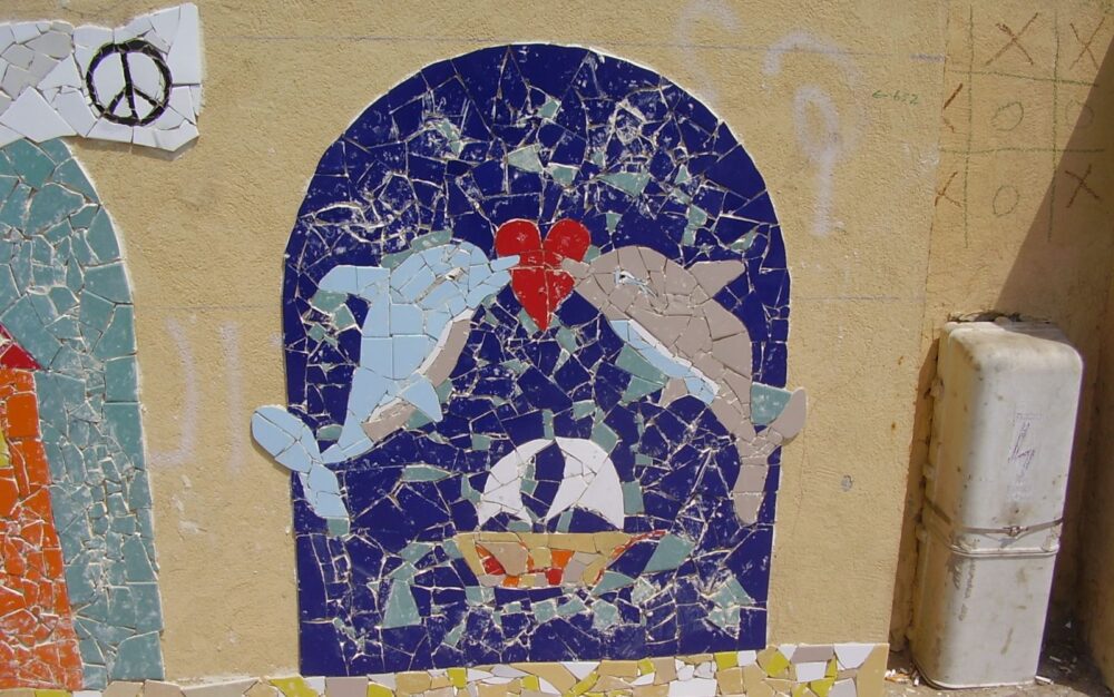 Created as part of the international CITYarts project, the Peace Wall in Jaffa’s Ajami neighborhood is the work of Arab and Jewish artists, schoolchildren and volunteer residents. It depicts themes such as olive branches, local landmarks, people shaking hands and, somewhat surprisingly, dolphins. The process was preceded by numerous workshops across schools in the area, which sought to create dialogue and cooperation between the city’s children and teens.