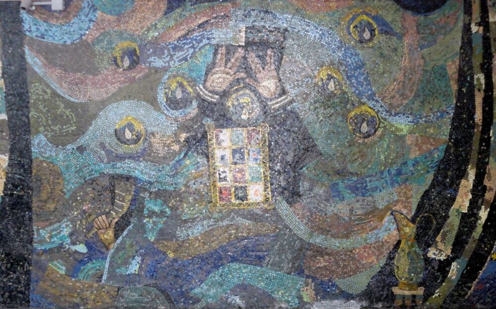 Another work of Nahum Gutman, this large mosaic depicting the Jewish Priestly Blessing hangs in the Tel Aviv Rabbinate building. The blessing involves the raising of joint hands as seen in the mosaic, where it is surrounded by other religious elements such as a shofar, the priestly breastplate of precious stones, an oil urn and seven candles representing the seven-branched candelabra. The mosaic was created in the Italian city of Ravenna based on Gutman’s plans and was erected in Tel Aviv in 1961.