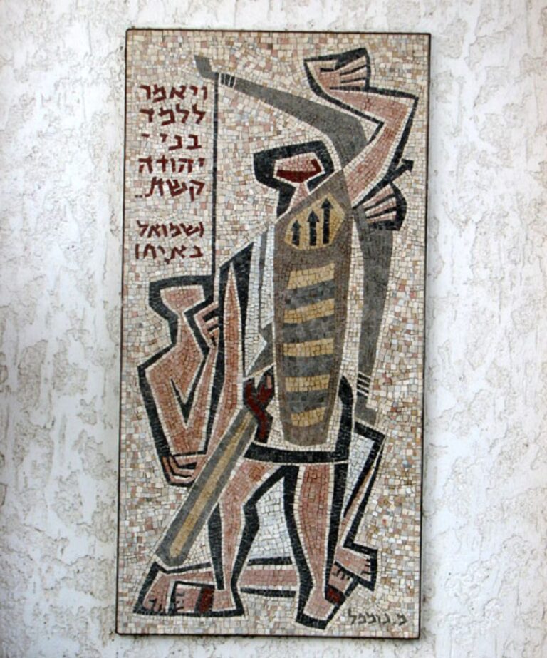 Almost every city in Israel has a public building called Yad Labanim, a memorial center for its fallen soldiers. In the central city of Petah Tikva, the Yad Labanim building is adorned by a series of mosaics created by prominent mosaic artist Mordechai Gumpel that draw on biblical scenes and stories. The mosaic shown here includes a verse from King David’s lament after the death of Saul and Jonathan, often recited at Memorial Day ceremonies.