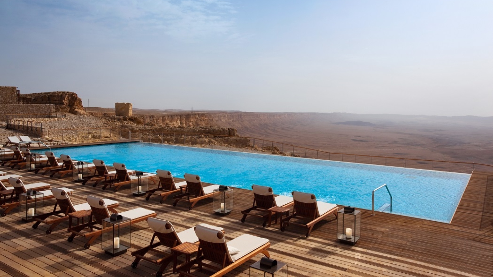 The opening of this breathtaking property in 2011 put the Negev town of Mitzpeh Ramon on the map of upscale tourism. Situated at the edge of the one-of-a-kind Ramon Crater across 12.5 acres, the hotel boasts 111 one- or two-story private-entrance villas and suites. Thirty-nine of the ground-floor rooms open to personal infinity pools, while the upper-floor rooms open to balconies.