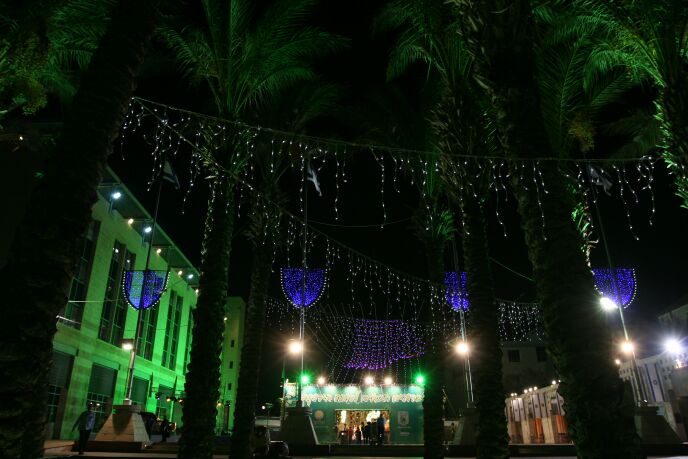 Safra Square sukkah at night. Photo by Anna Kaplan/FLASH90