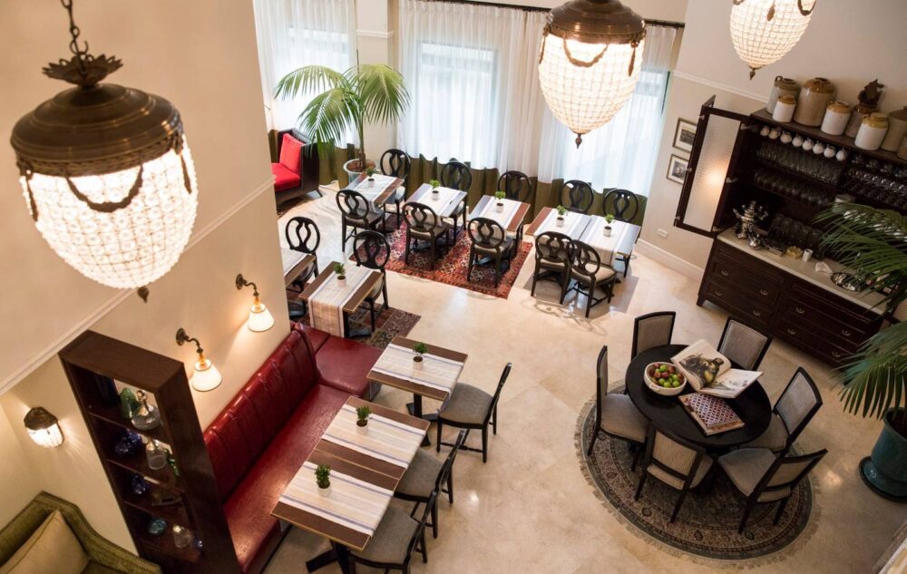 Housed in a restored 19th-century villa near the capital city’s historic Russian Compound, the 24-room Villa Brown is decorated in a fusion of neoclassical, Ottoman and contemporary styles in hues of red, emerald and mauve. The towering arched doorways were preserved for an authentic look, and the outdoor café is set off from the street by lush greenery, making it popular with tourists and locals alike.