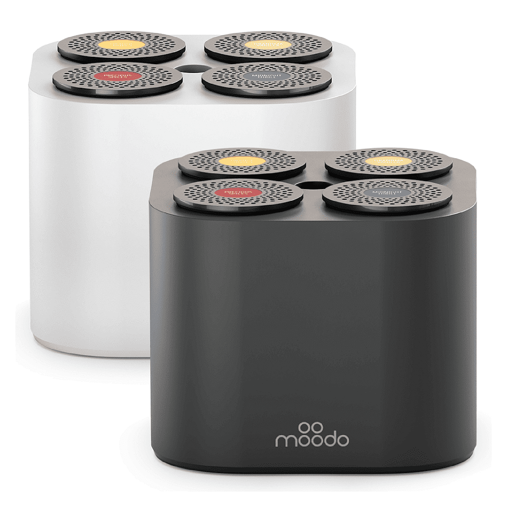 Each Moodo diffuser can hold up to four different scent capsules at once (there are 32 overall). Cost is around $30 for each pod, which delivers some 60 hours of aroma. The small, four-inch by five-inch Moodo device, which runs for $130, doubles as a three-layered HEPA air purifier. A travel version dubbed MoodoGo is also available.
