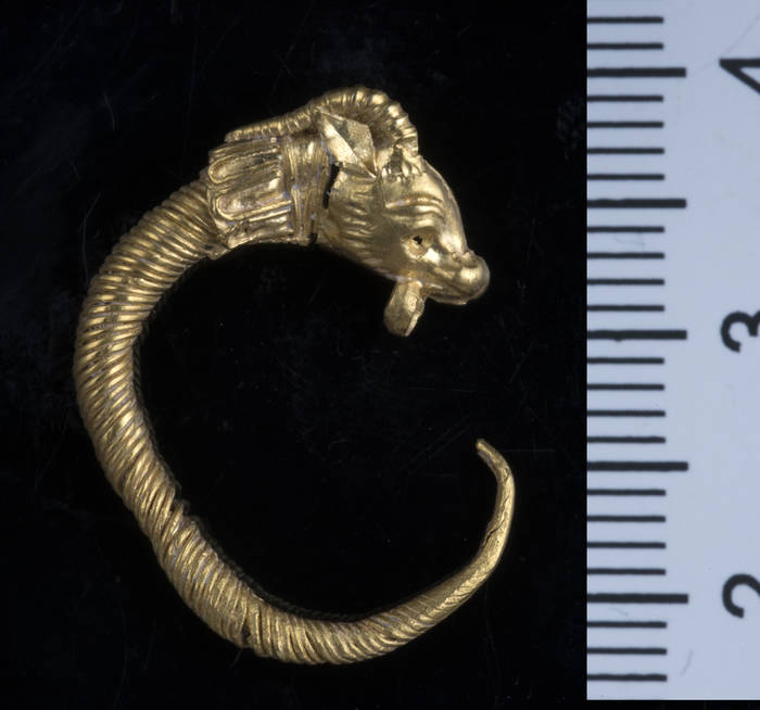 The hoop earring bears the head of a horned animal, possibly an antelope or deer. Excavators also found nearby a gold bead with intricate embroidered ornamentation resembling a thin rope pattern.