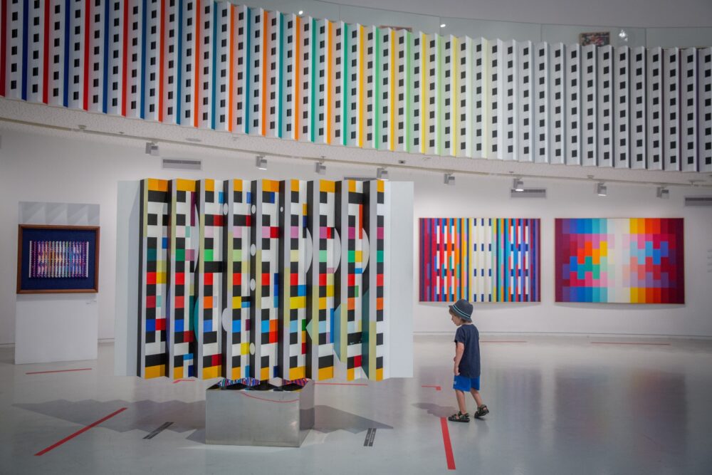 Guided by gloved docents, visitors have the opportunity to explore and interact with Agam’s everchanging artwork and submerge themselves in a sphere of time and movement, change, and the unexpected.