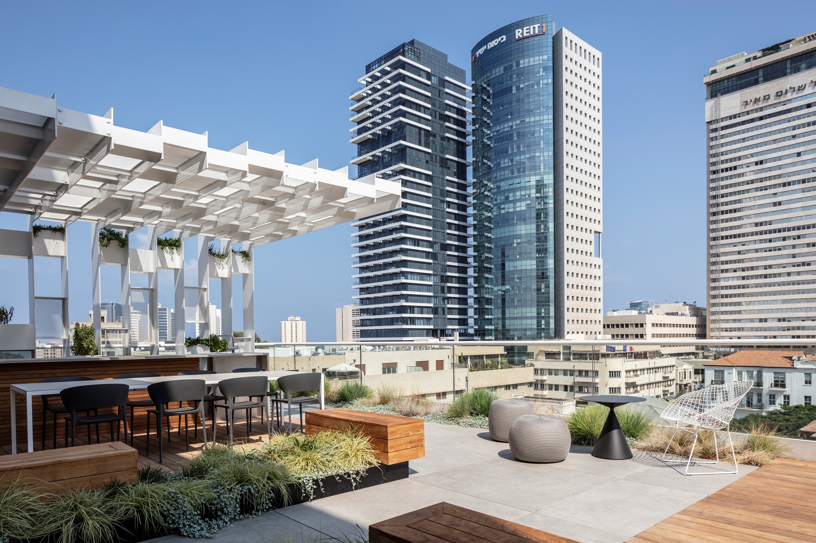 The fourth floor leads out onto a large canopied rooftop terrace that frames the view of Tel Aviv’s Mediterranean Sea coastline.