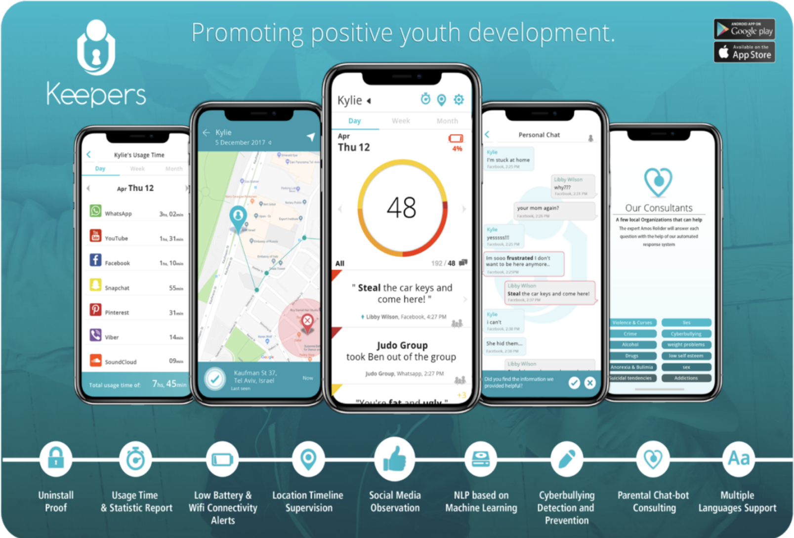 Jerusalem-based Keepers Child Safety does look at the social media texts on your child’s phone, but its neuro-linguistic programming algorithm, based on IBM Watson technology, is scanning for worrisome words and only reports potential dangers, not any specific content.