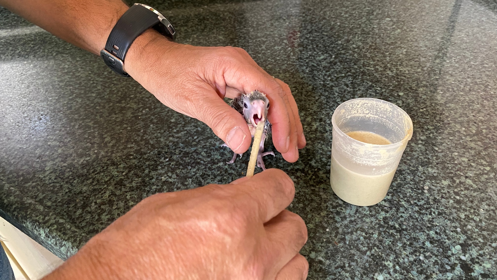 As he speaks, he’s hand-feeding a bald baby parakeet while a mare named Venus gives a contented snort in her corral outside.