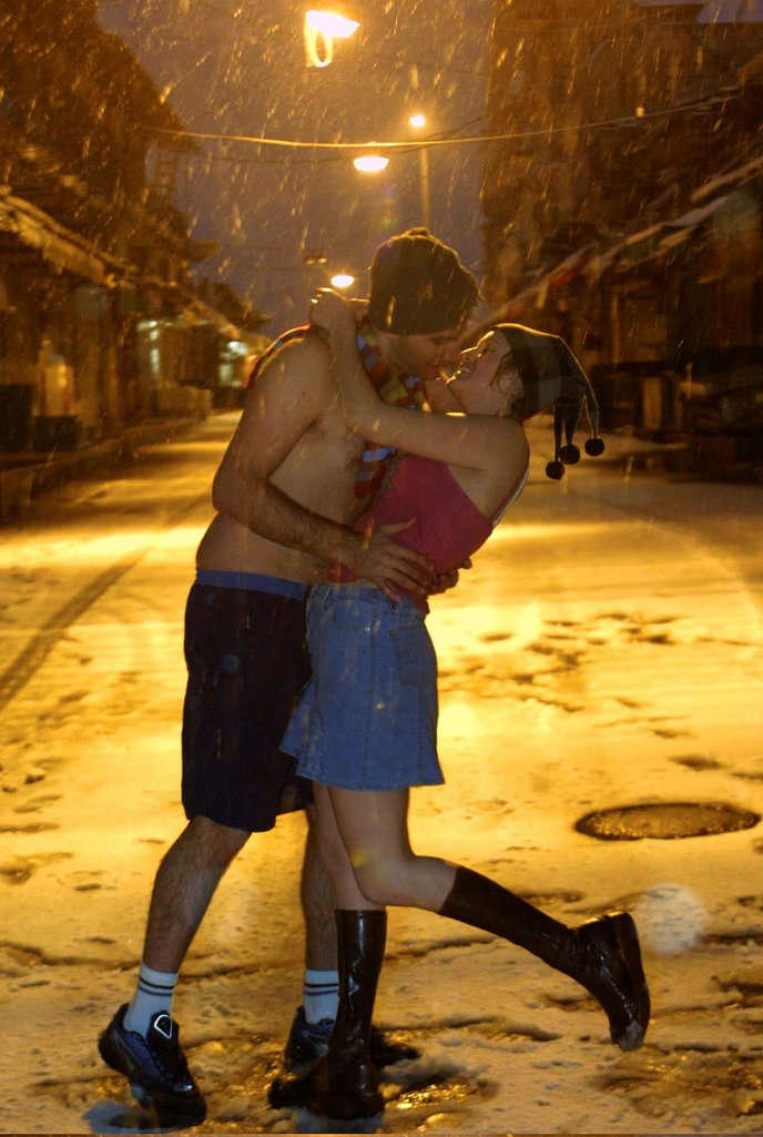 Love will keep you warm. A couple kiss in the snow at Machane Yehuda in Jerusalem, wearing little but their love. Photo by Flash90