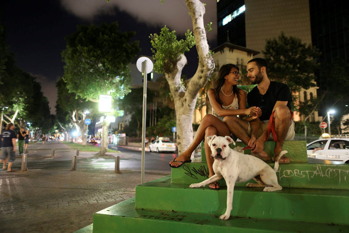 A young couple take a moment to relax with their dog on Rothschild Avenue in Tel Aviv in the midst of last summer’s Operation Protective Edge, when Code Red alert sirens sounded frequently in the city warning of incoming rockets fired from Gaza. Photo by Nati Shohat/Flash90