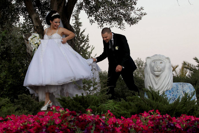 A groom from the Arab Village of Beit Hanina helps his bride with her dress in the Yemin Moshe neighborhood of West Jerusalem as they take photographs before their wedding. Photo by Nati Shohat/Flash90