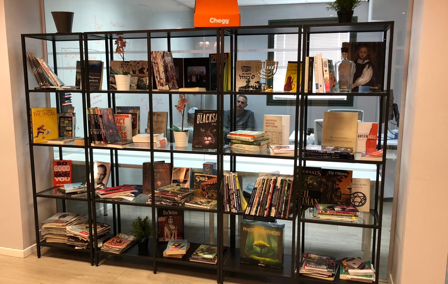 Other Chegg employees have since added to the library, which encompasses five and a half meters of shelving to hold more than 100 comic books in English and Hebrew.