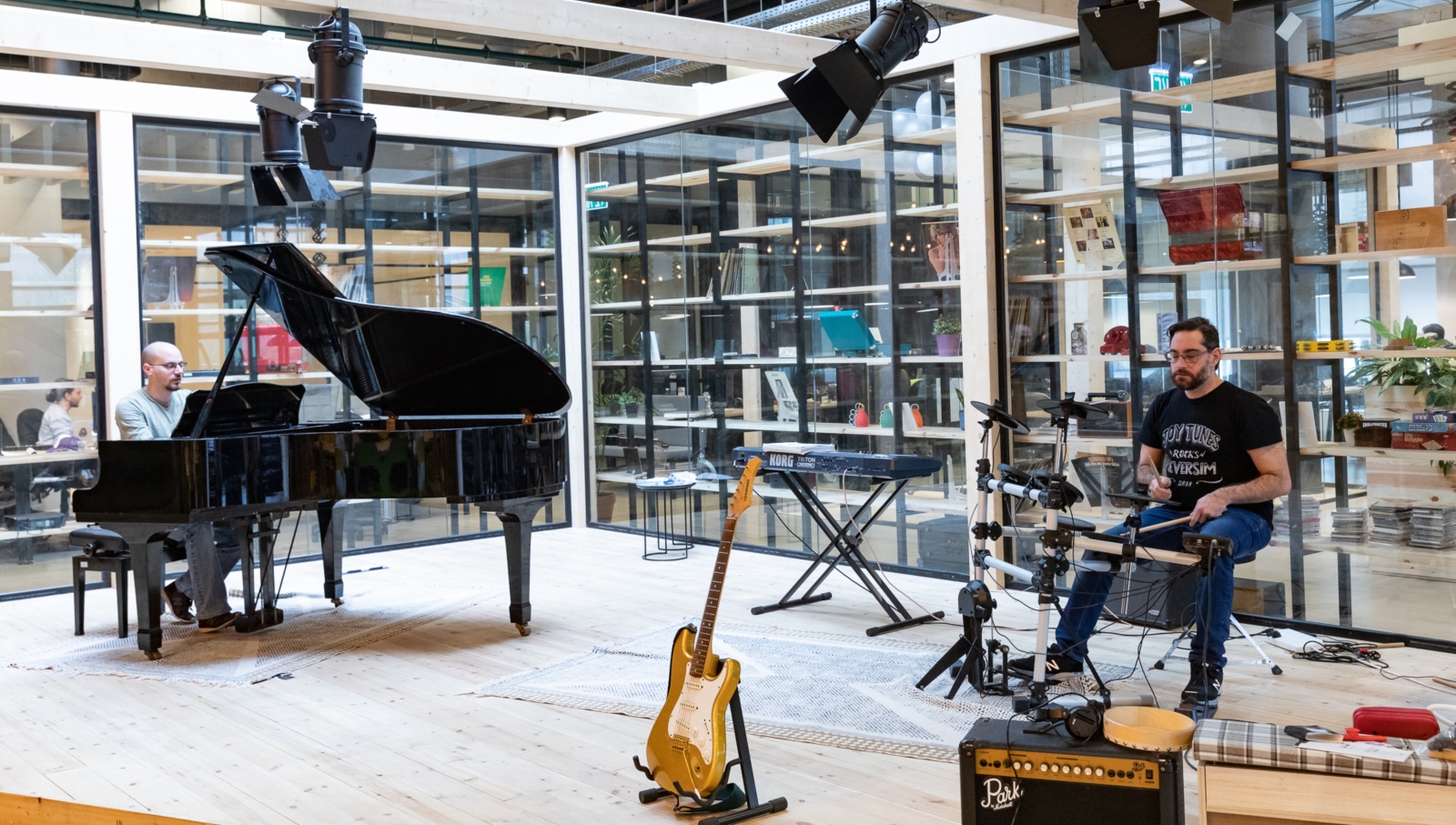 A musical startup that developed Simply Piano and many other popular applications for learning to play keyboards and other musical instruments, JoyTunes commissioned Roy David Architecture to plan a fully equipped performance area in its Tel Aviv office so that the programmers and musicians on staff can have a high-quality jam session anytime.