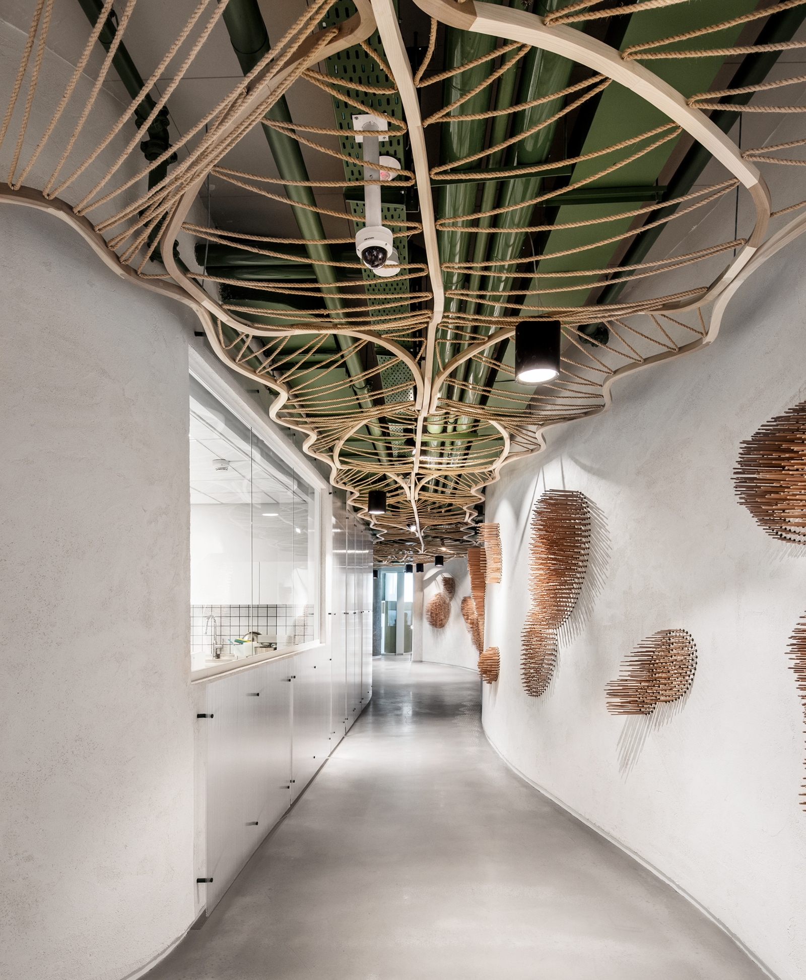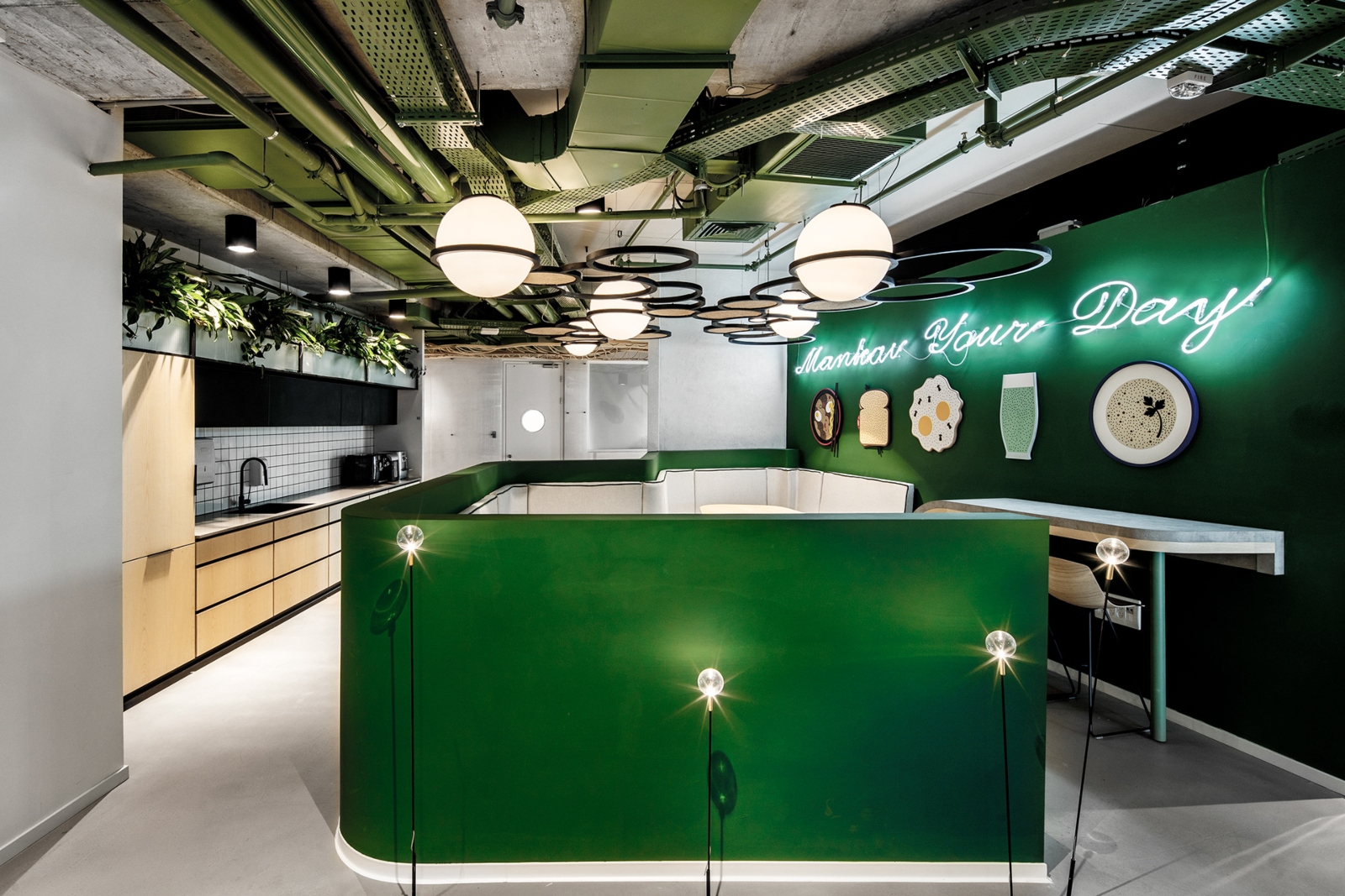 Roy David Architecture of Tel Aviv recruited artist Ohad Benit and designer Avi Fadida to create myriad wooden handcrafted elements for the walls and ceilings to evoke the feel of a Vietnam forest. Dynamic features and use of brilliant green color throughout the space created a riverlike fluidity with “social islands” embedded in it.