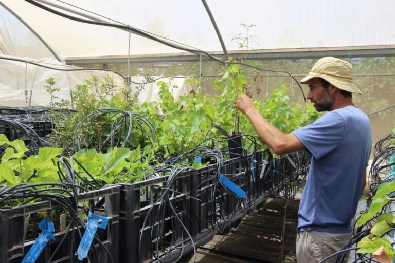 Propagations of living landrace relic grapes at a heritage nursery at Moshav Shekefin the Negev,are inspected by nursery manager and research colleague Assaf Bashan. They are clones of relic grapes endemic to the region sourced during the researchers’ fieldwork in the Western Negev. Photo courtesy of University of Haifa