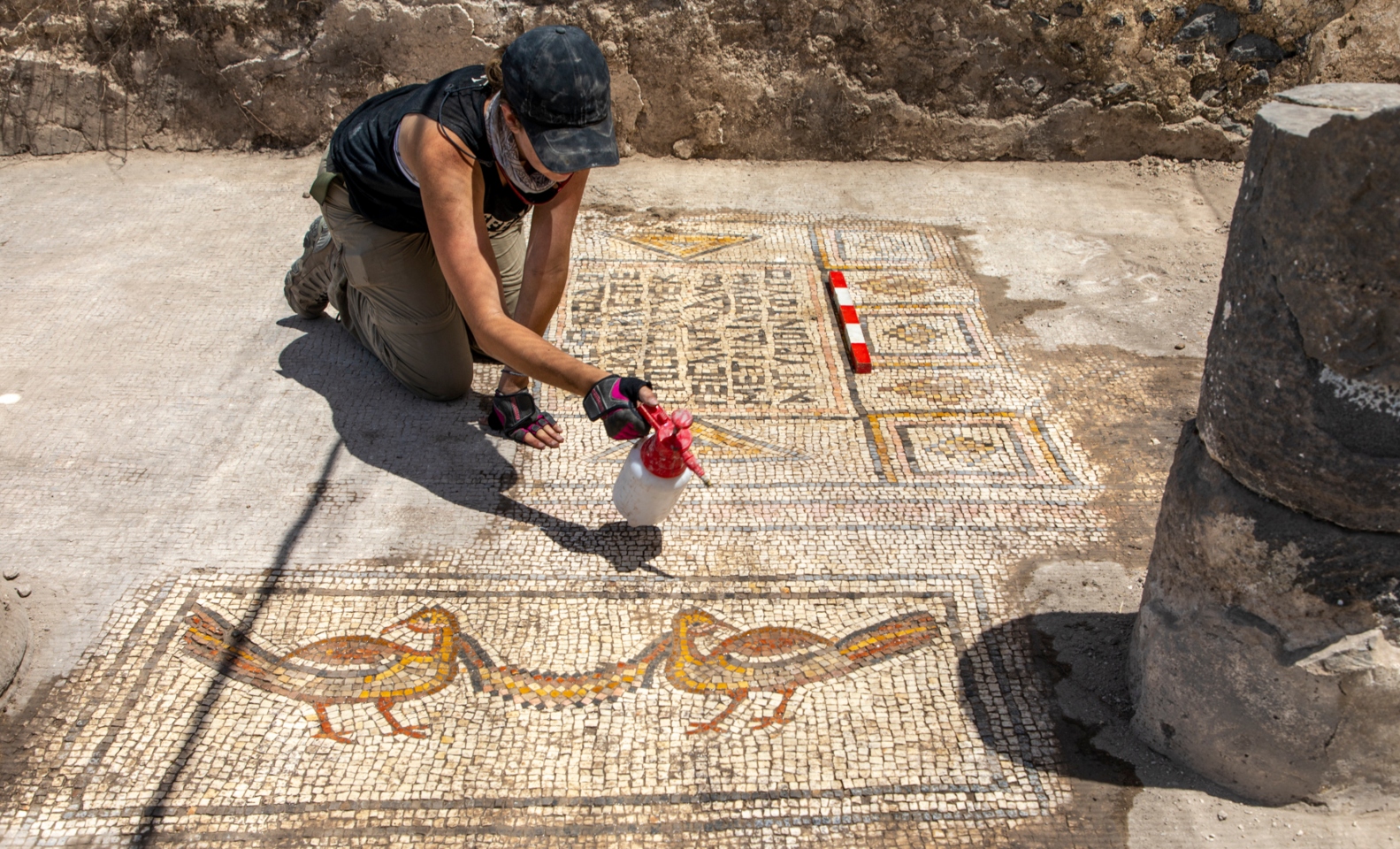 American archeologist Jessica Rentz cleans a pair of birds holding a garland. Behind her is one of two dedication inscriptions in the mosaic. Photo by Michael Eisenberg
