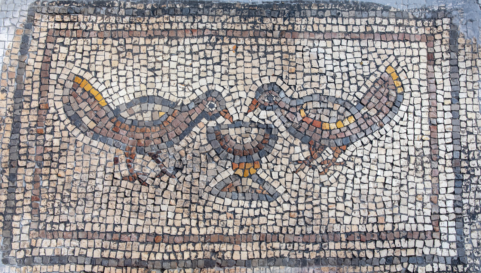 Hippos mosaic detail: birds drinking from a goblet of wine. Photo by Michael Eisenberg