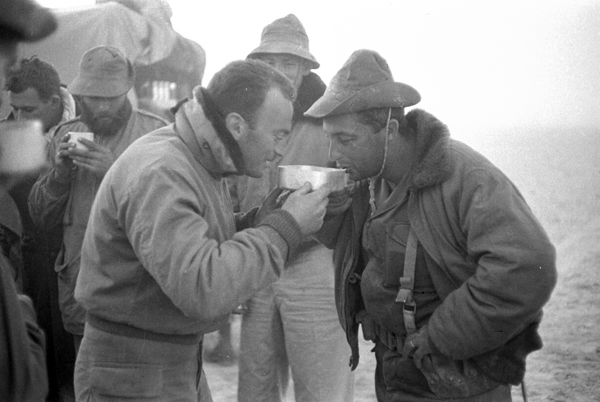Out in the battlefield with his men, sharing a hot drink from the communal messting…