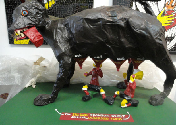 Yuval Caspi and Ido Shemi, two contemporary artists, share a studio but work separately in humorous ways to expose the Israeli identity and spirit, using papier-mâché sculpture, soccer slogans and mascots, mixed media, art happenings and even holograms that illustrate in layers the unusual and sometimes hypocritical society in which they live.