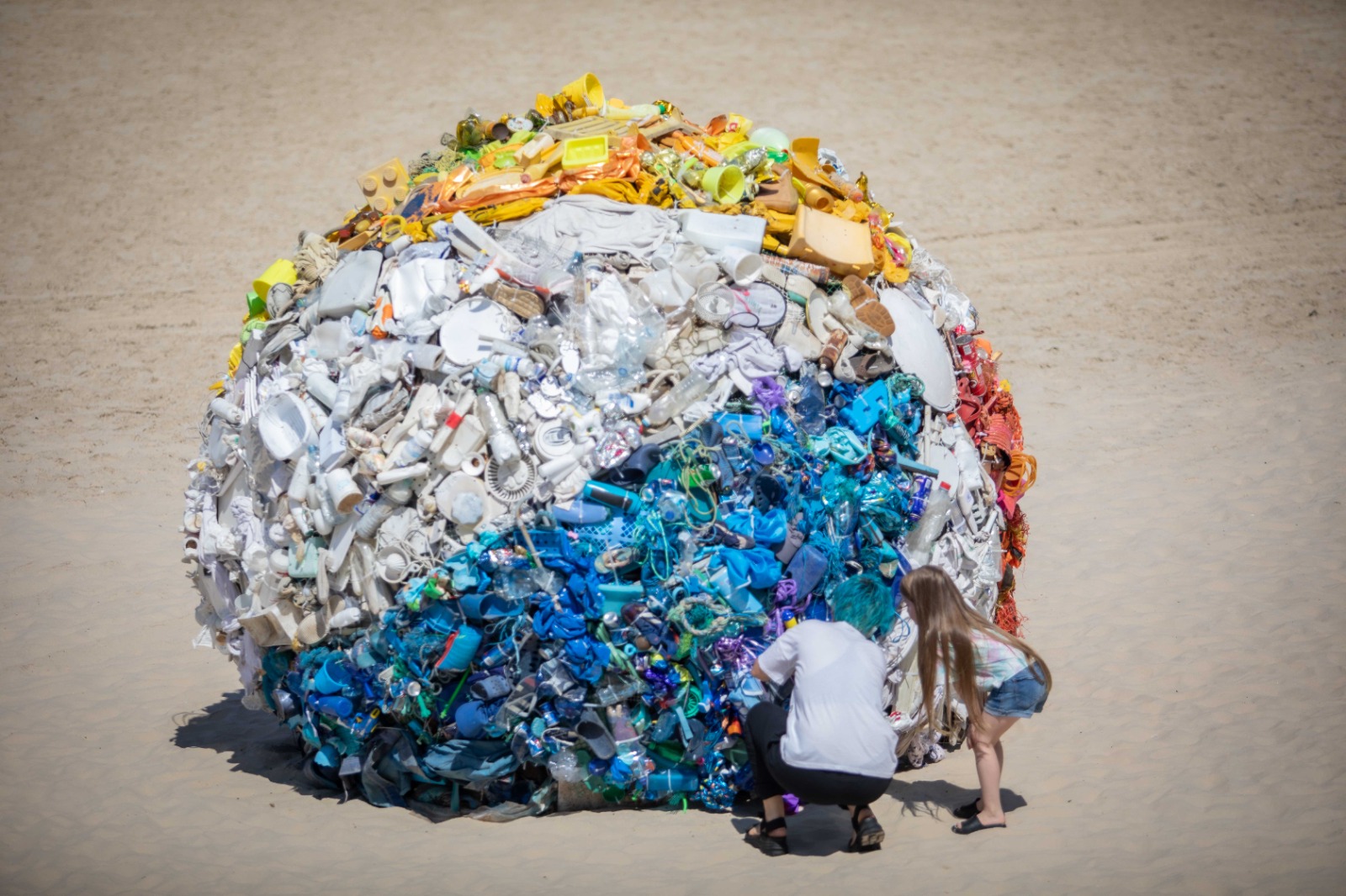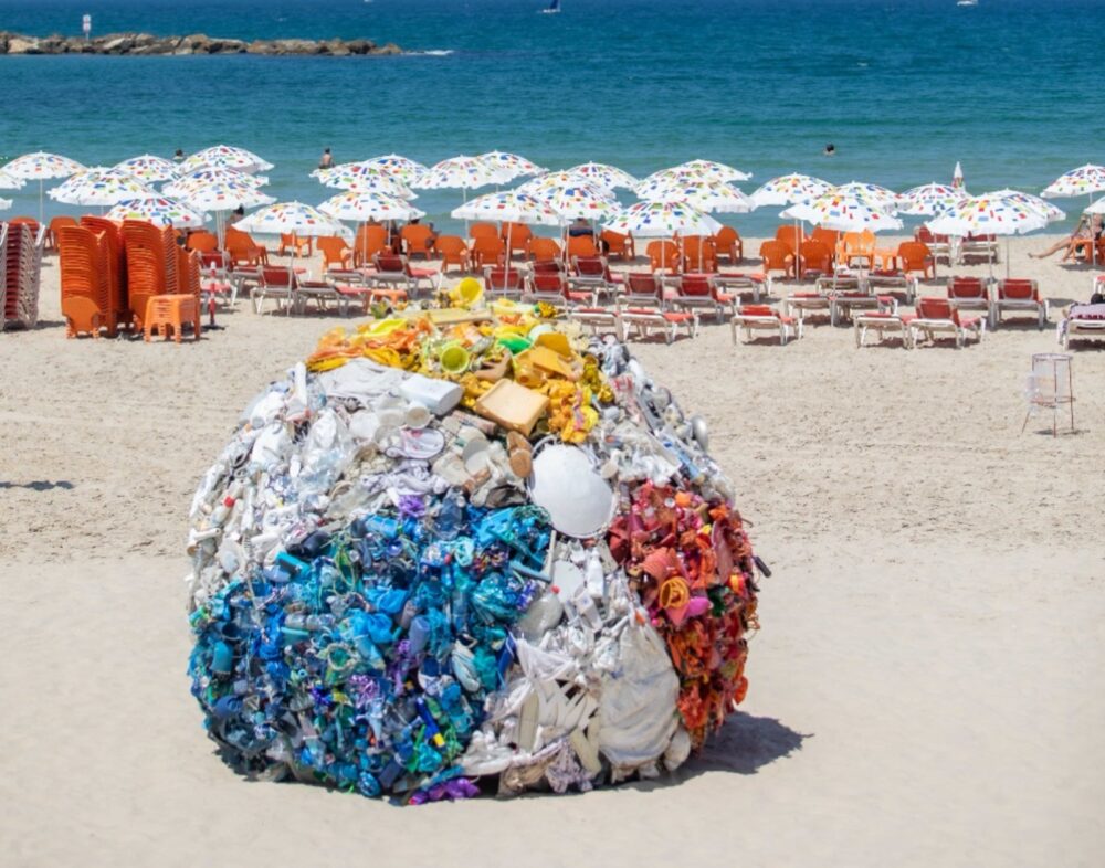 Artist Tal Tenne Czaczkes made the huge waste ball sculpture for the Tel Aviv-Yafo municipality, which recently passed a law prohibiting single-use plastic, such as disposable dishes, bags and plastic, on bathing beaches.
