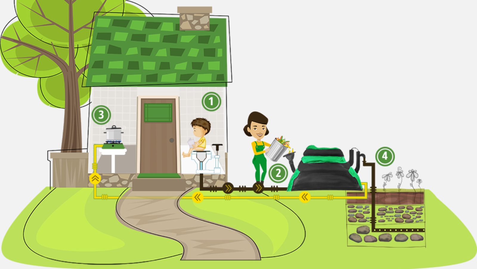 The waste is flushed directly into the HomeBiogas solar biodigester, where it is broken down by bacteria and transformed into biogas for household needs along with other waste such as food scraps and animal manure.
