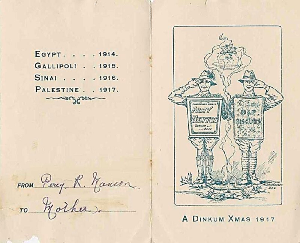 In 1917, the ANZAC Division sent their loved ones a holiday card listing the division’s battle stations during the Great War: Egypt 1914, Gallipoli 1915, Sinai 1916 and Palestine 1917.