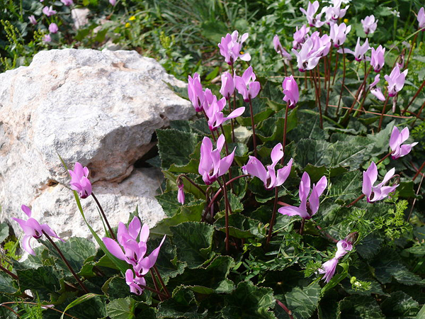 As the popular 1950s Israeli song goes, “From under a rock, a very sweet cyclamen blooms suddenly / And the shining sun kisses and decorates her with a pink crown / ‘Cyclamen, cyclamen’ the bird twitters, ‘Peek at me for a moment’ / [But] the glorious cyclamen hides within the rock / staying hidden from every living being.” (The complete lyrics and a recording of the song are available at Zemer.co.il, an online collection of early Israeli popular songs).