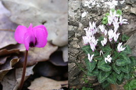 There are many different species of cyclamen; the ones common to Israel are the Cyclamen coum (pictured left) which in Hebrew is known as “Greek cyclamen” (but should not be confused with the Cyclamen graecum that actually grows in Greece), and Cyclamen persicum or “Persian cyclamen” (pictured right) — a misnomer as it doesn’t really grow in Persia at all.