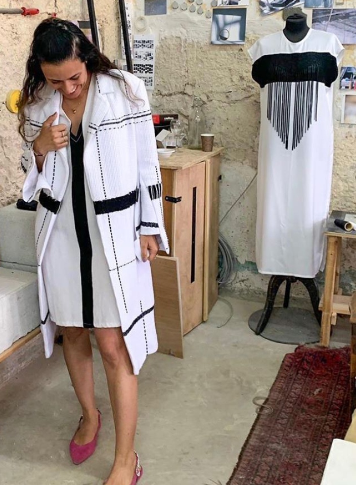 Liraz Cohen modeling one of Jerusalem fashion designer Adi Yair’s black-and-white woven creations at Beit Alliance, a historic building with studios for artists and musicians. Photo: courtesy