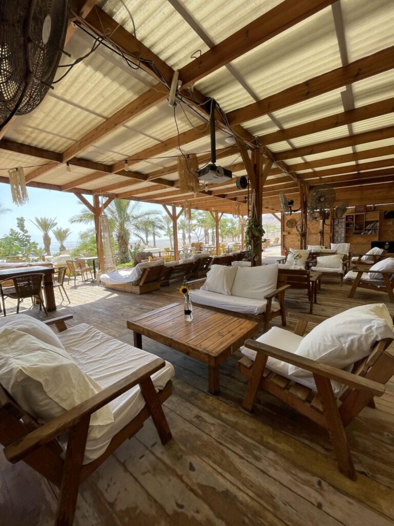 Situated on a hillside, it has a spectacular view over the turquoise waters and salt formations of the Dead Sea and the Jordanian mountains on the other side.
