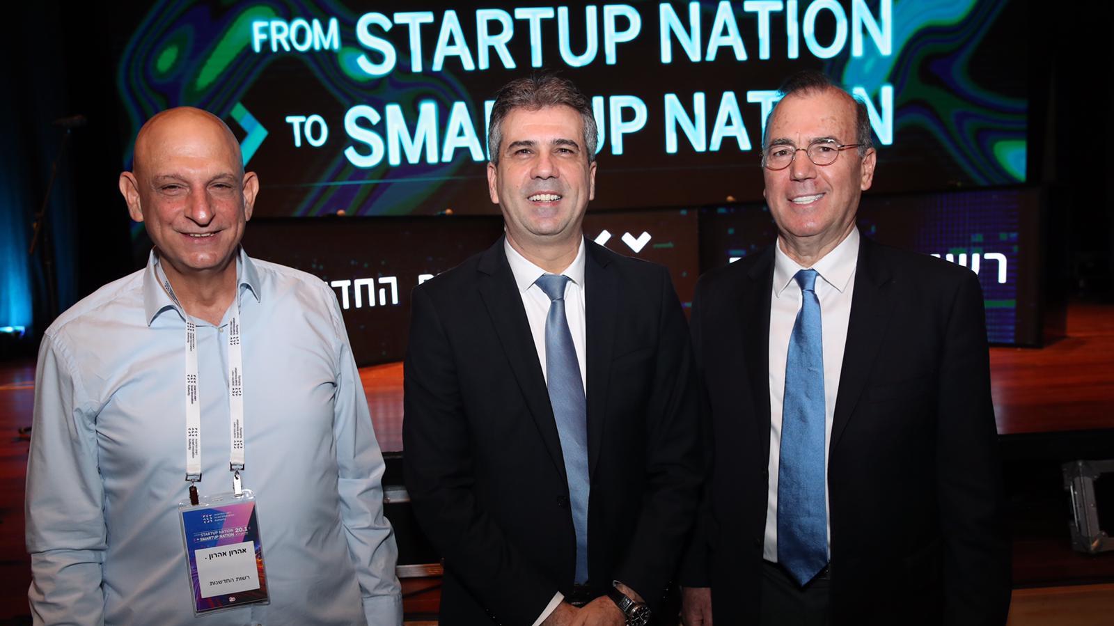 From left, Israel Innovation Authority Director Aharon Aharon with Economy and Industry Minister Eli Cohen and Ami Applebaum, chief scientist, at the January 2019 IIA conference. Photo by Oded Karni