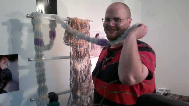 Ben Gal snipped off one of his fabric business cards to give ISRAEL21c, and showed us his scarves, recycled handbags and knitted jewelry made of silk, mohair or linen.
