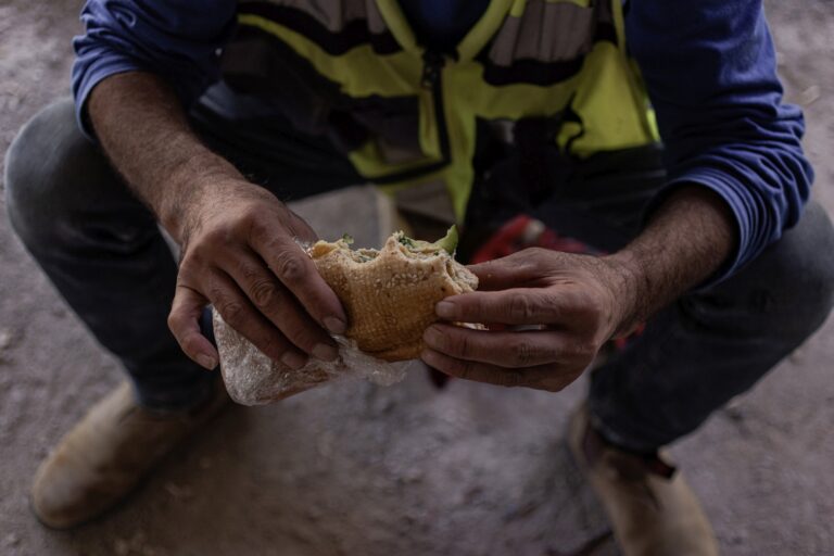 We see images of Thai laborers in the Arava and Turkish and Sudanese construction workers who spend their lunchbreak resting on a construction site or in the fields, eating food they have made themselves or bought from others in their community out of plastic containers.