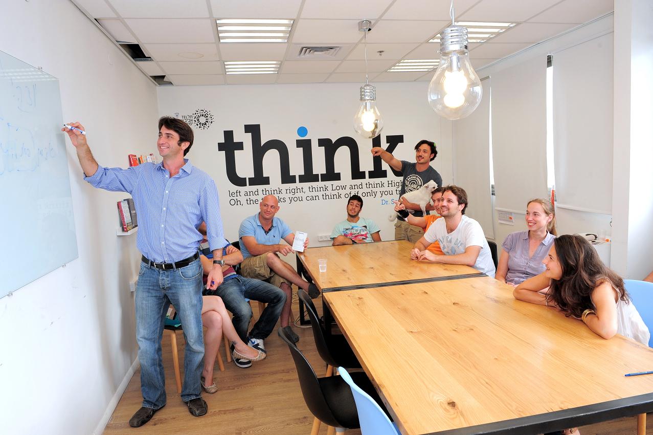 Entrepreneurs brainstorming in The Library, a municipal coworking space. Photo courtesy of the Tel Aviv municipality