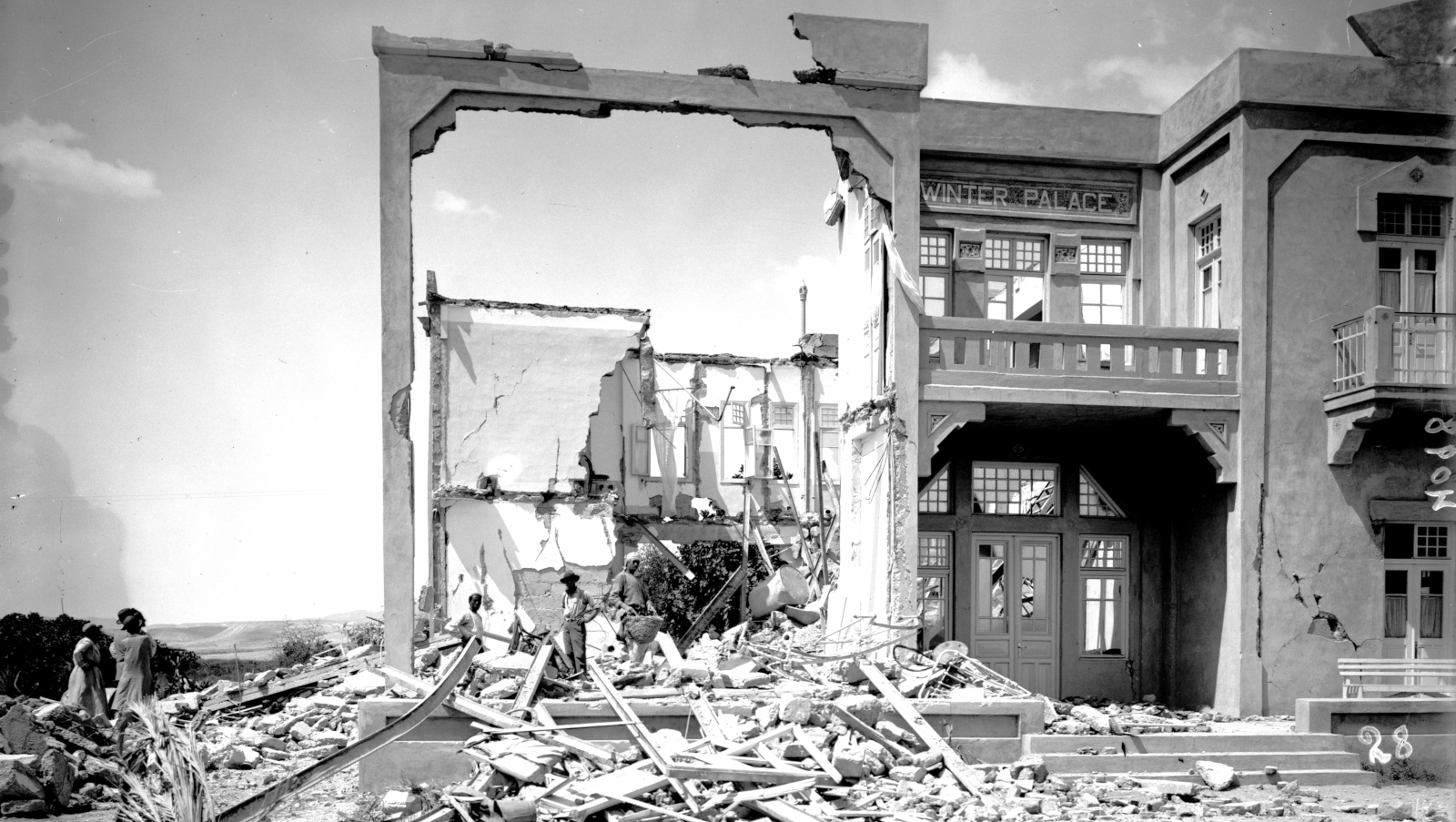 Three black-and-white photos of earthquake damage in Nablus came from Doar HaYom reader Yeshayahu Blachman, who worked for grocery importer and supplier Spinneys. The photos, he explained in his letter to the library, were taken by the store manager in Nablus.