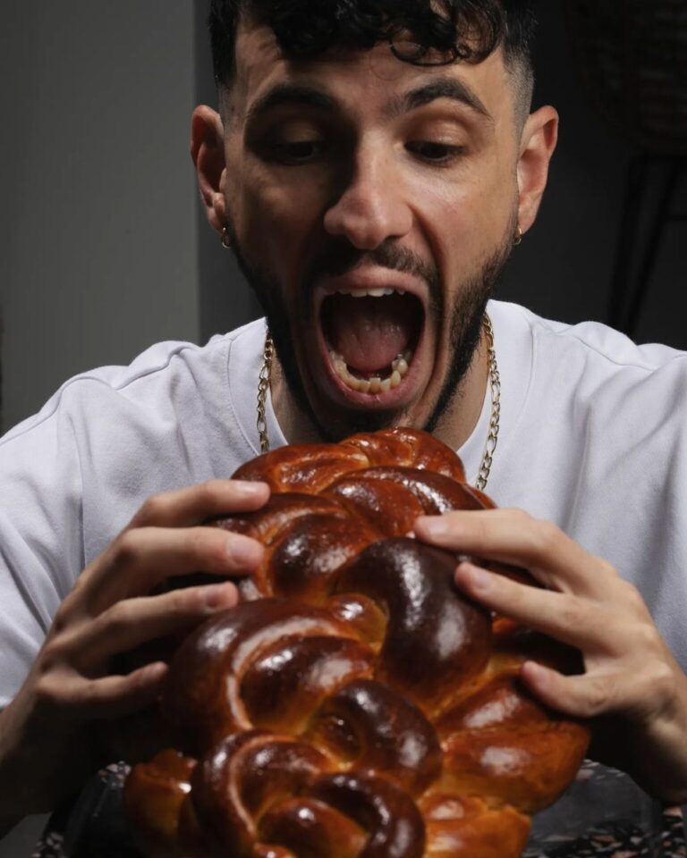 Chabasov looks playful when holding up two challah loaves on either side of his face, or mischievous when opening his mouth, as if ready to take a big bite.