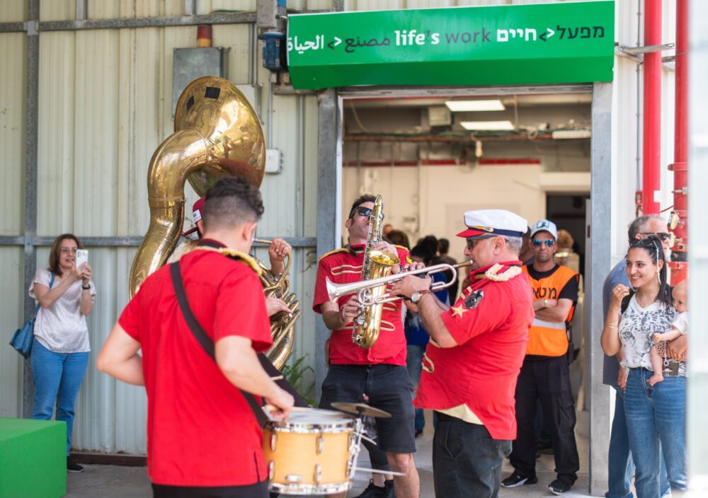 A band celebrates Zumu’s opening of the “Life’s Work exhibition in a former factory in Nahariya. Photo by Yair Mehuyas/Studio ZooZ