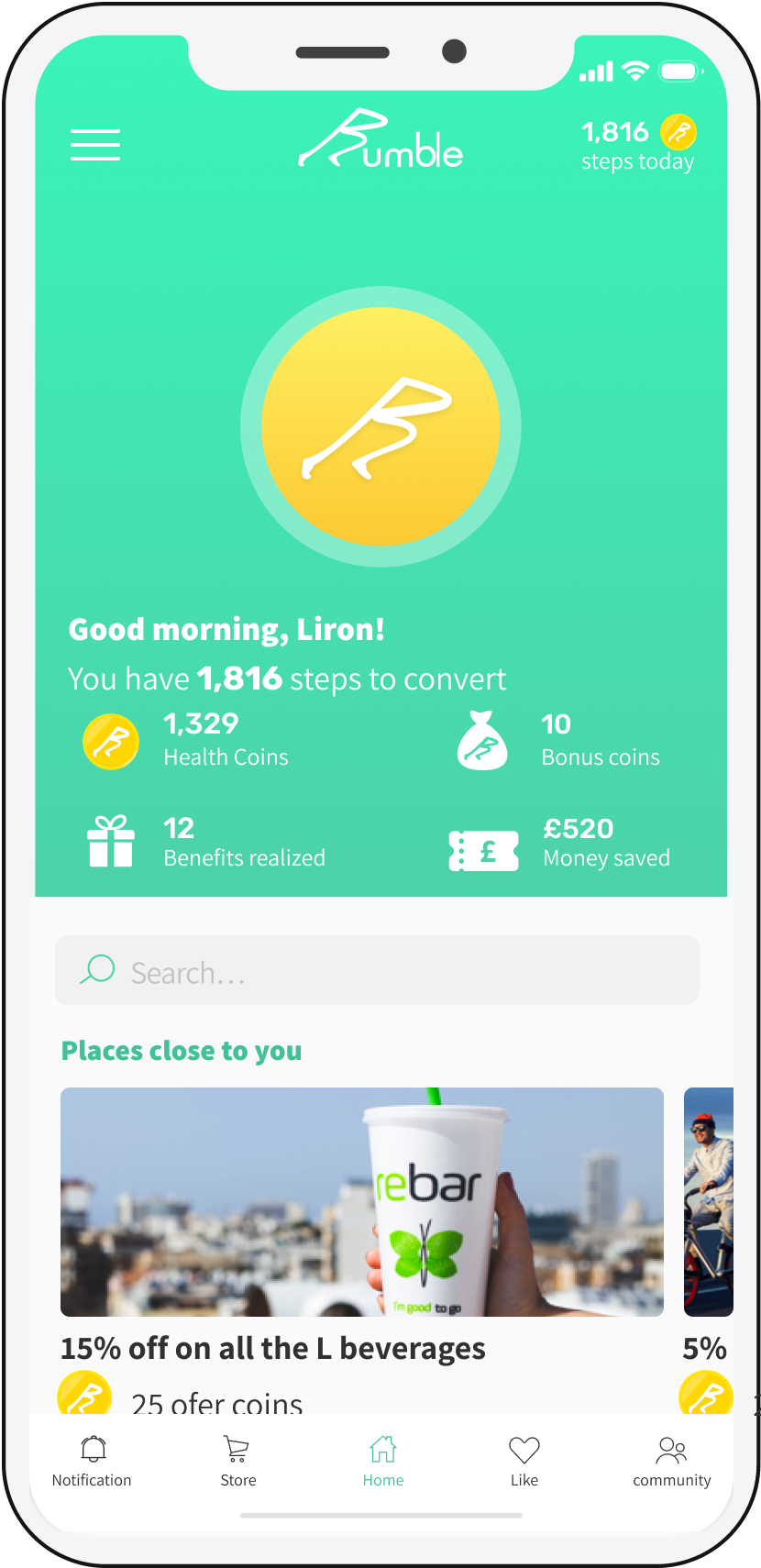 The Rumble app tracks how many steps you take and converts that data into virtual tokens exchangeable for real world goodies – a smoothie at Israeli fruit and juice chain ReBar, a magazine at a Steimatzky bookstore, a pair of new shoes, or a session with a personal trainer.