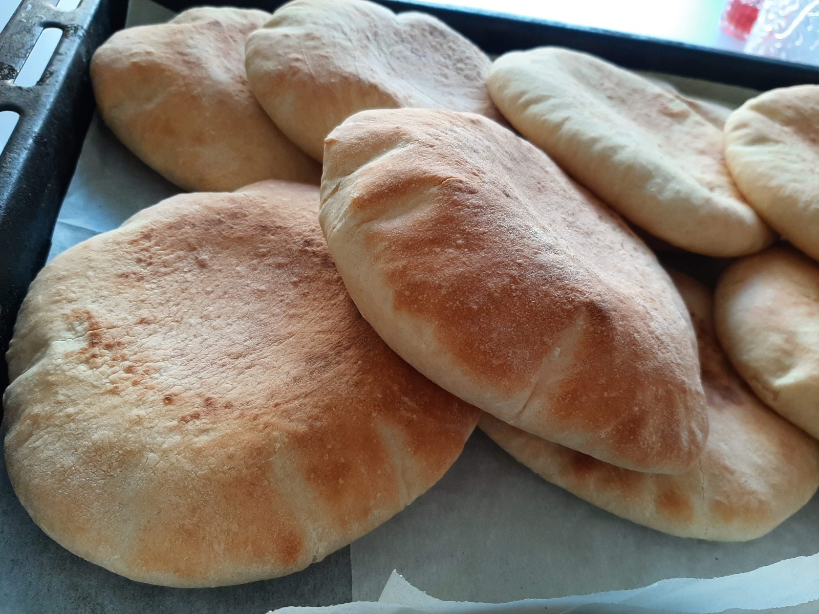 Made from a simple white dough, they are quite easy to make. Balls of risen dough are rolled out into thin circles, then baked at the highest temperature possible, so they get the sudden burst of heat necessary for them to puff up dramatically, leaving a hollow center.