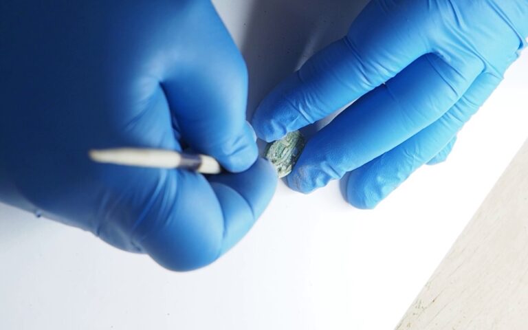 Conservationist Yosef Bukengolts cleans the scarab seal in the IAA labs. Photo by Assaf Peretz/Israel Antiquities Authority