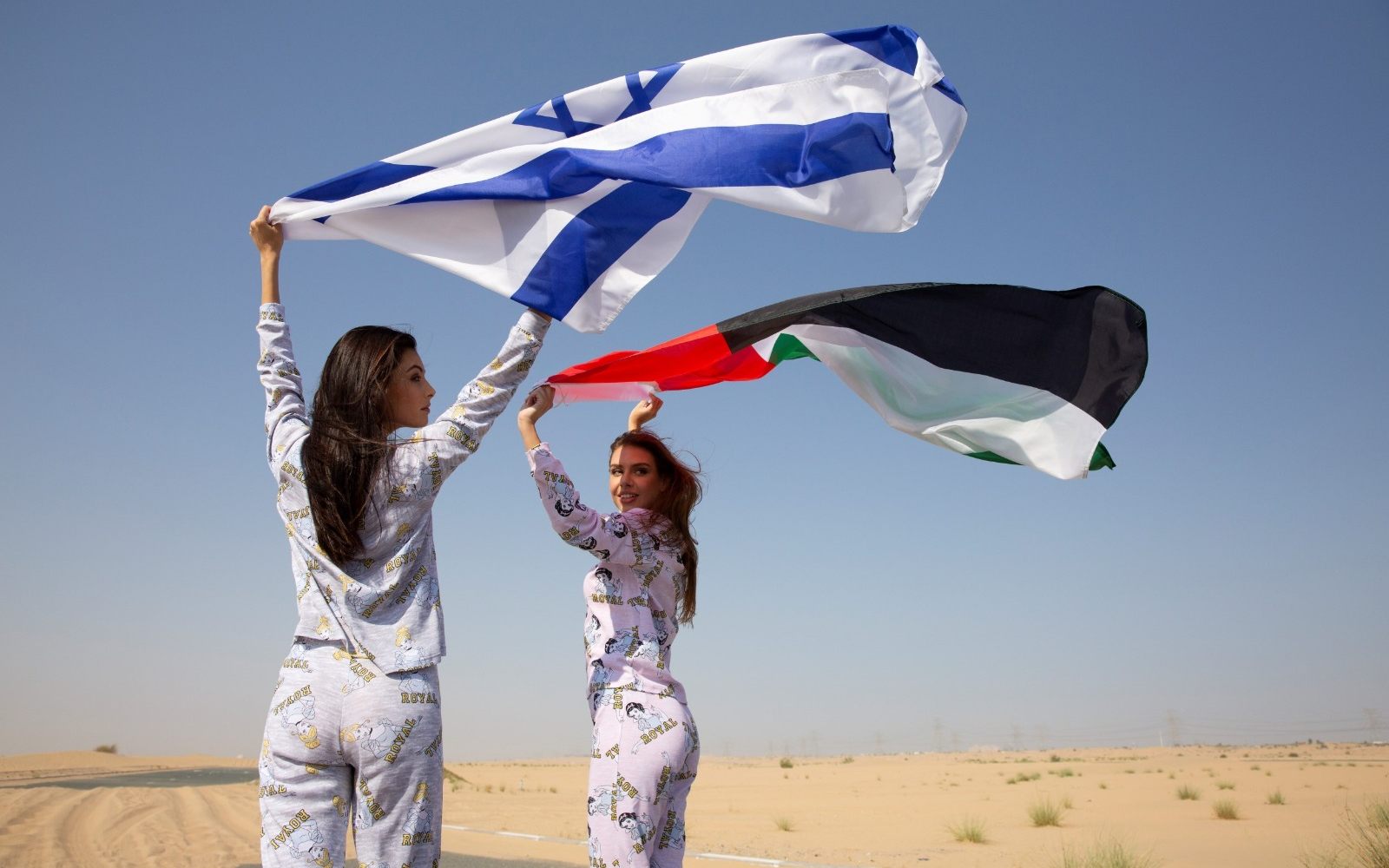 Israeli model May Tager holds up the Israeli flag alongside UAE resident and model Anastasia Bandarenka, who waved the Emirati flag. Photo by Omri Rosengart