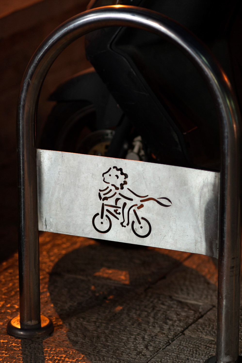 A more playful version of the standing lion – seen riding a bicycle with a windblown mane and tail – adorns the many new bike-parking racks around Jerusalem.