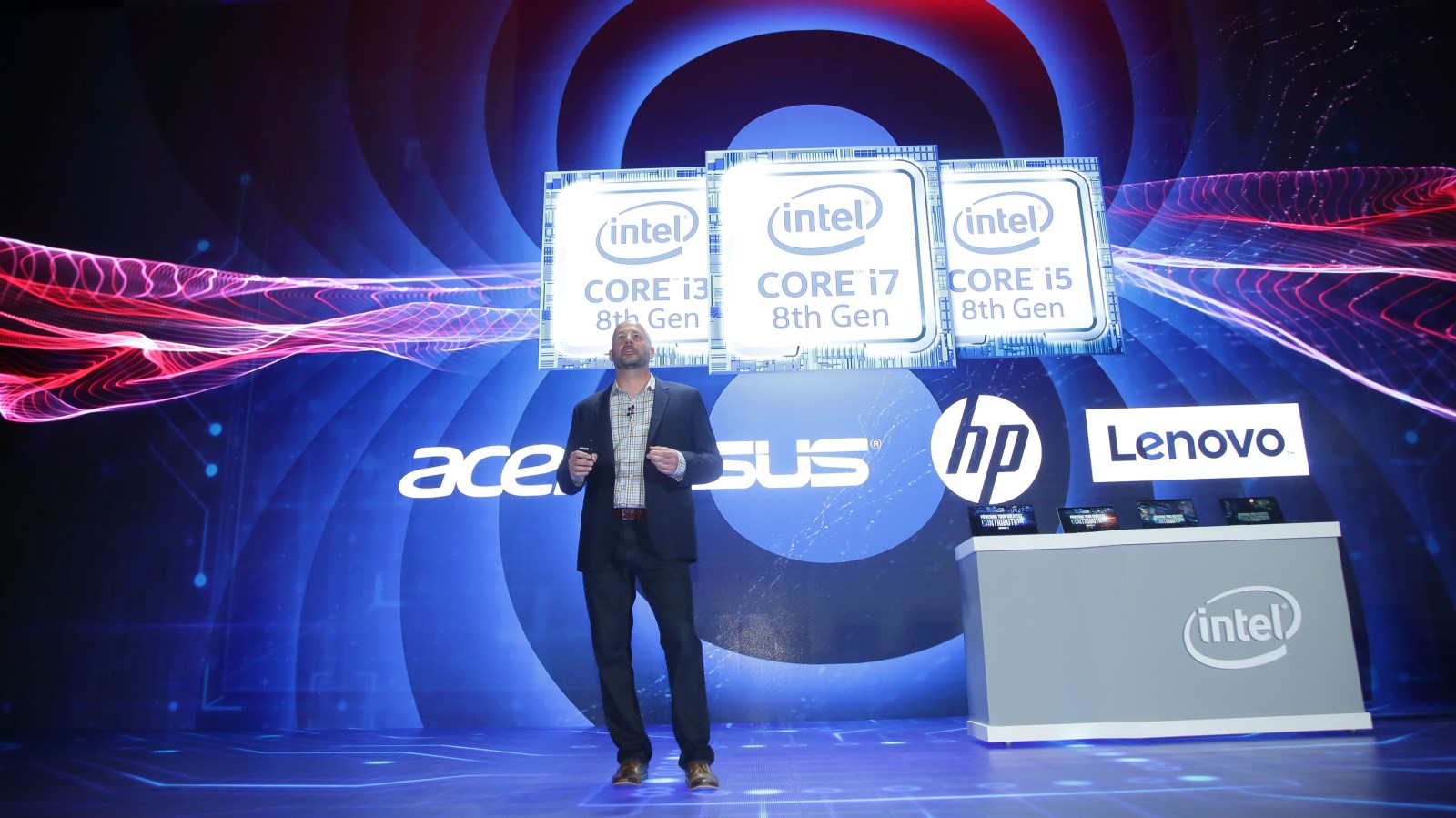 Intel Corporate VP Gregory Bryant announces the Whiskey Lake U-series and Amber Lake Y-series, the newest additions to the 8th Gen Intel Core processor family. Photo courtesy of Intel Corporation