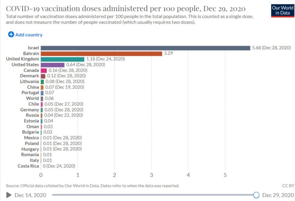 Israel regained the No. 1 spot by December 27, with 4.37 people vaccinated out of 100. Bahrain was second with 3.23, and the UK third with 1.18. By December 28, Israel increased it lead, with 5.68 people per capita getting their first shot.