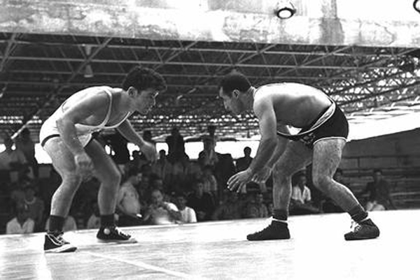 August 23, 1965. A wrestling match between an Israeli and an Iranian opponent during the 7th Maccabiah Games, Israel.