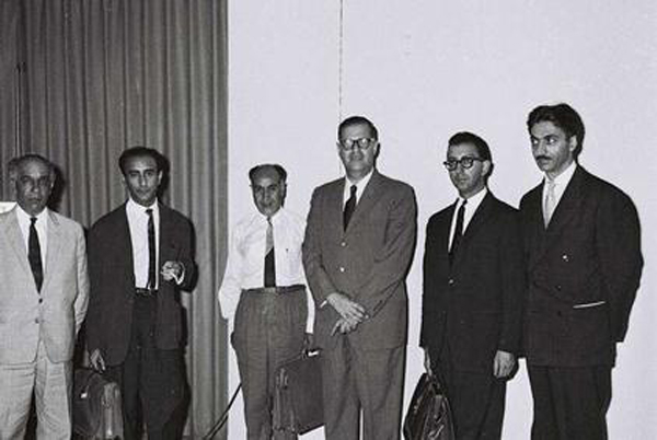 August 14, 1960. Israeli Minister of Education, Abba Eban welcomes the Iranian delegates to the Conference on Science in the Advancement of New States, Rehovot, Israel.