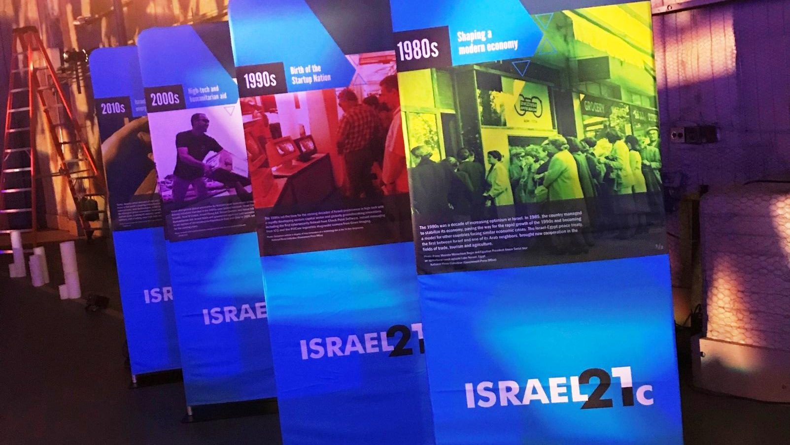 The 14 stunning images depicting each decade of Israeli achievement were printed out in large vibrant color and stood around the perimeter of the sound stage where guests entered and mingled before the show on June 10.