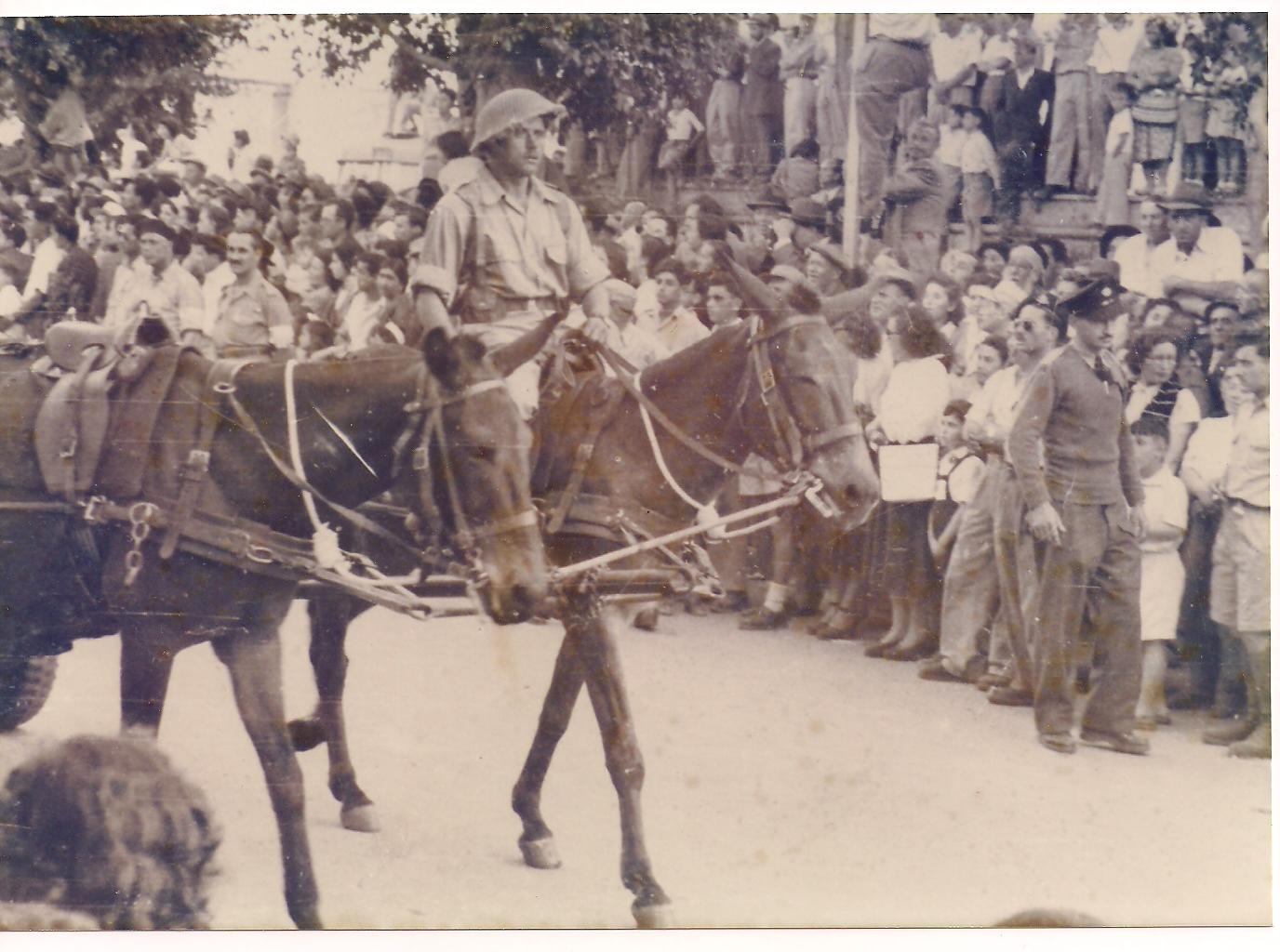 IDF Solidier Zeev (Willy) Adler leading the Mule Drivers Brigade at the 1949 IDF Parade. Photo via Wikimedia Commons