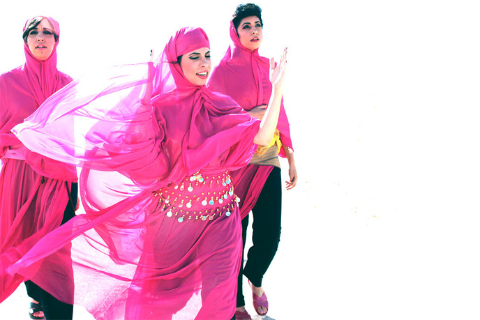 Fresh “twists” are rife in the vibrant video that shows the three sisters decked out in hot pink Sana’ani dresses and other colorful combinations of clothing, riding a jeep through the desert and battle-dancing three guys in identical track suits and hilarious modern-day fez caps.