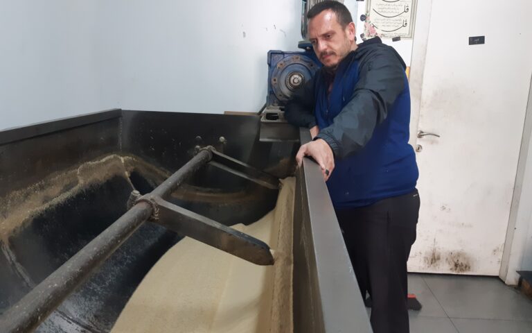 Five kilograms of sesame seeds are released down a chute every 20 minutes and then ground between two circular white basalt stones (quarried in Aleppo, Syria) giving off an intoxicating nutty aroma as the warm liquid runs into the canal below.
